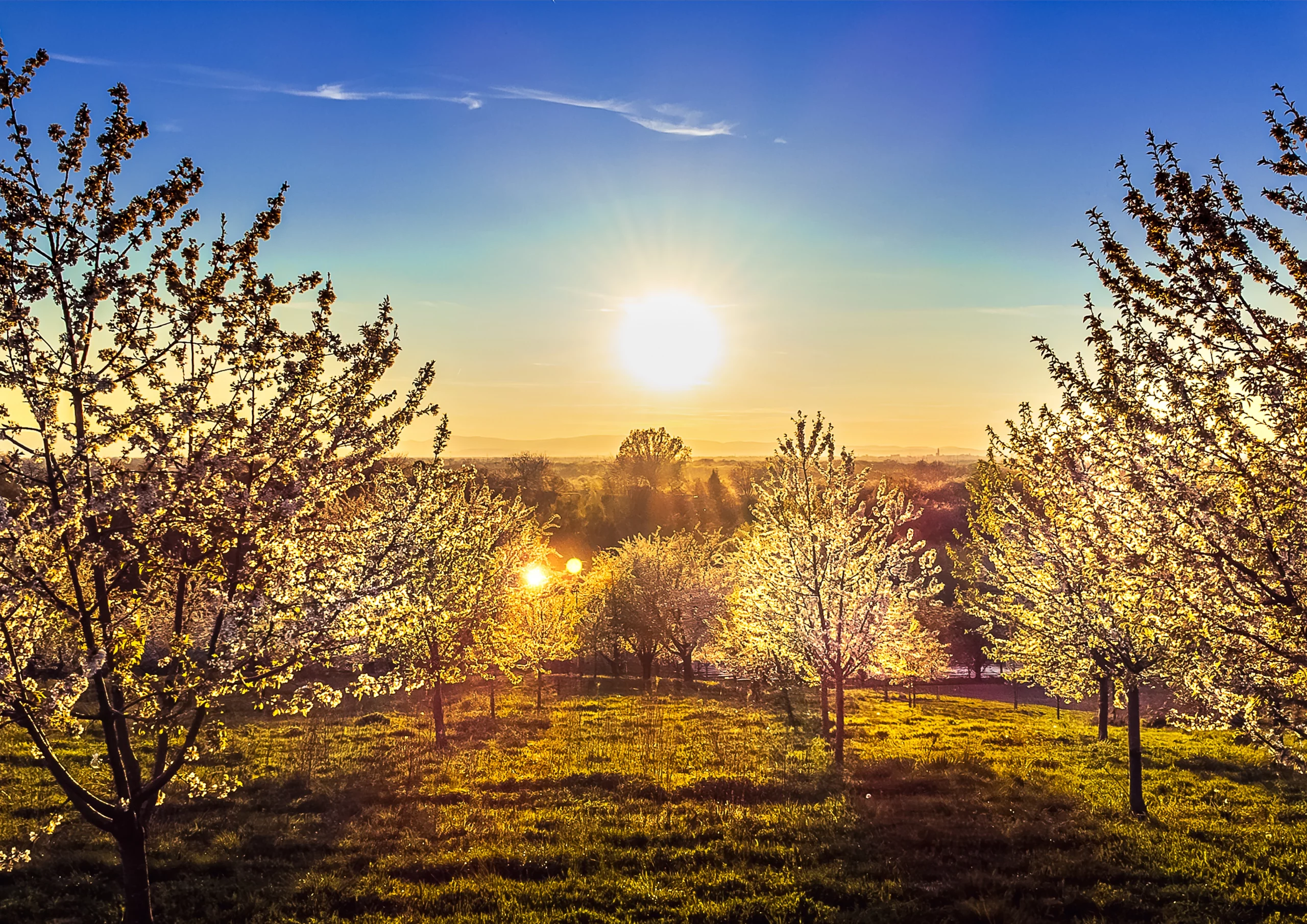 Sonnenuntergang über Kirschbaumfeld bei Appenweier